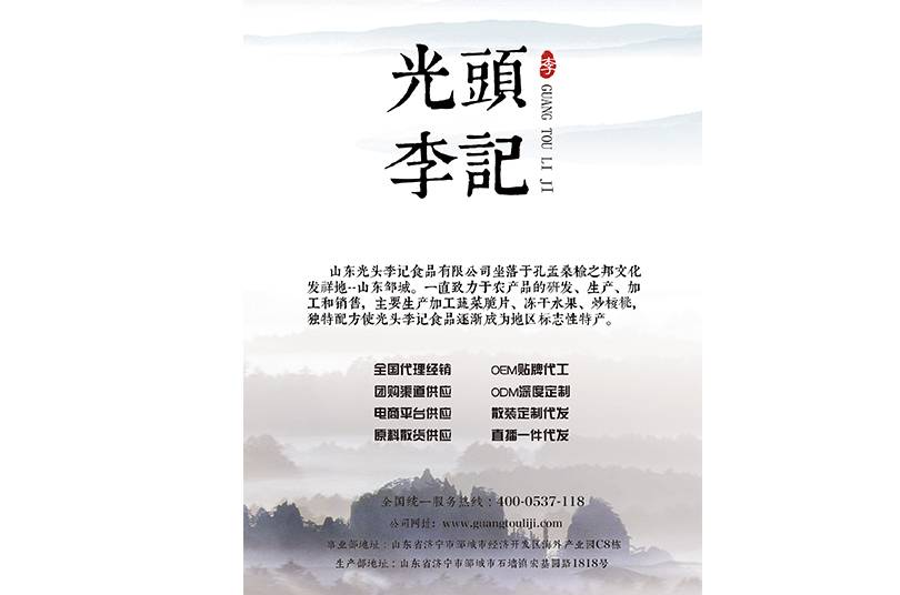 山东光头李记食品有限公司坐落于孔孟桑梓之邦文化发祥地——山东邹城,公司一直致力于休闲食品的研发、生产、加工和销售,通过完整的生态产业链,打造特色网红休闲零食,产品盖VF与FD两种工艺的果蔬脆片,以及果脯坚果等各类爆款零食。